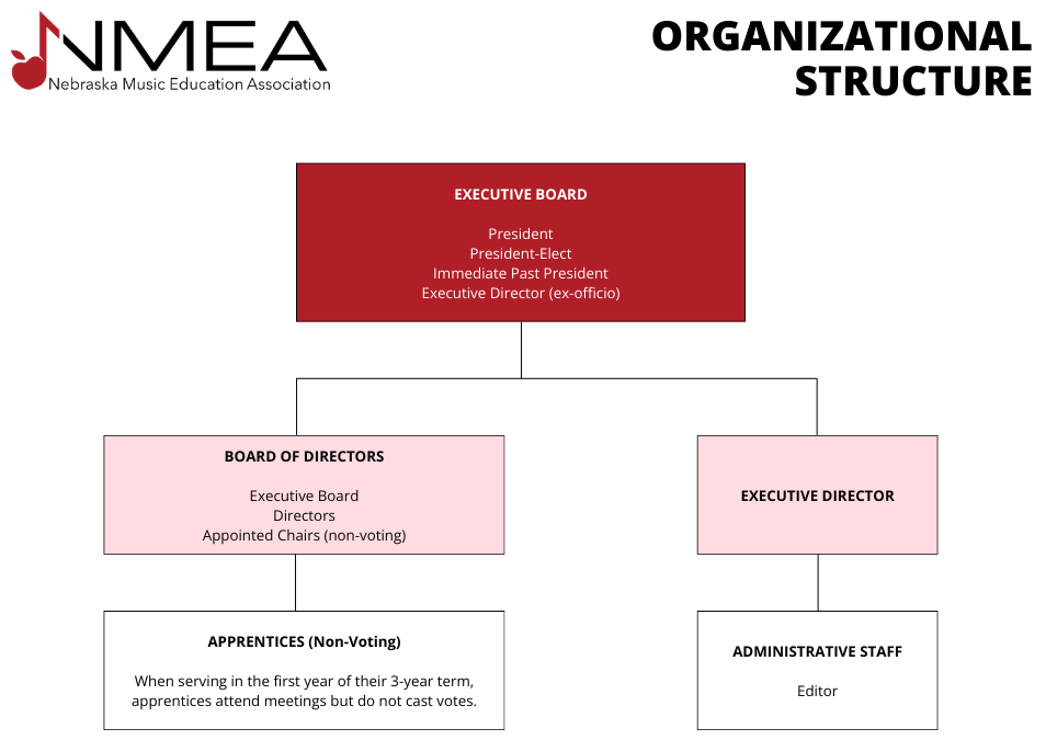 LEADERSHIP STRUCTURENMEA is led by a volunteer Board of Directors dedicated to supporting Nebraska’s students and music educators. The Board includes 14 voting members: 11 elected representatives and three presidential officers. Elections are held each fall. To see a detailed list of our current Board of Directors, visit our Leadership & Staff page.
